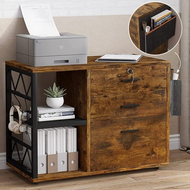 Anyway Go 3 Drawer Wood File Cabinet With Lock Mobile Lateral Filing Cabinet Printer Stand With Open Storage Shelves For Home Office Gray Oak Walmart Com